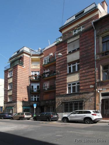 „A négyemeletes, téglaburkolatú épület U alakban tágas és hangulatos kertet fog közre, kis melléképülettel a gondnok vagy a kertész számára. Az előtér bár szűk, de vállmagasságig fekete márvány szegélyű rózsaszín márványlap burkolja. Az I. és IV. emeleten csak 1 szoba hallos lakások voltak, a II. és III. emeleten a nagyobb lakásokat helyezték el: egy 3 szoba- és egy 2 szoba hallost, de harmadikként egy 1 szoba hallost is.” (Forrás: Pest építészete a két világháború között, 2001, 213–214.)