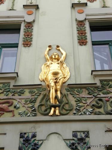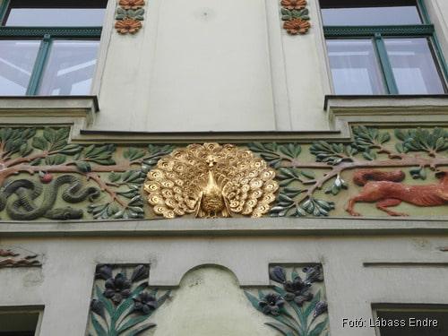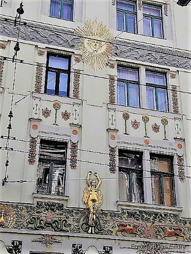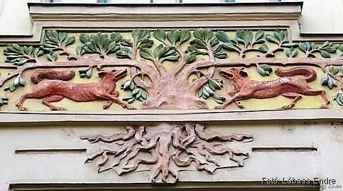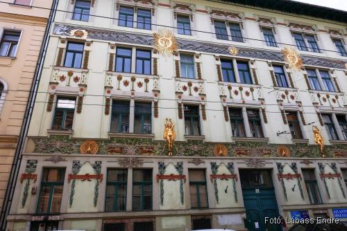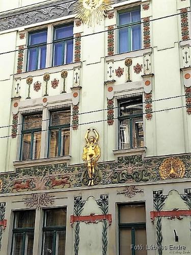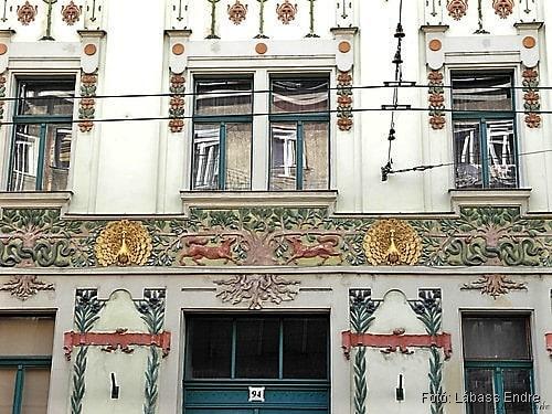Mindezt azonban csak a 94. szám alatti épület 2002 körüli hitelesen helyreállított homlokzatán fedezhetjük fel. A „testvérépület” homlokzata annyira lepusztult, hogy szépségről vagy értékelhető szimbolikáról itt nem lehet szó, csak Spiegel Frigyes alábbi leírása alapján lehet elképzelni.